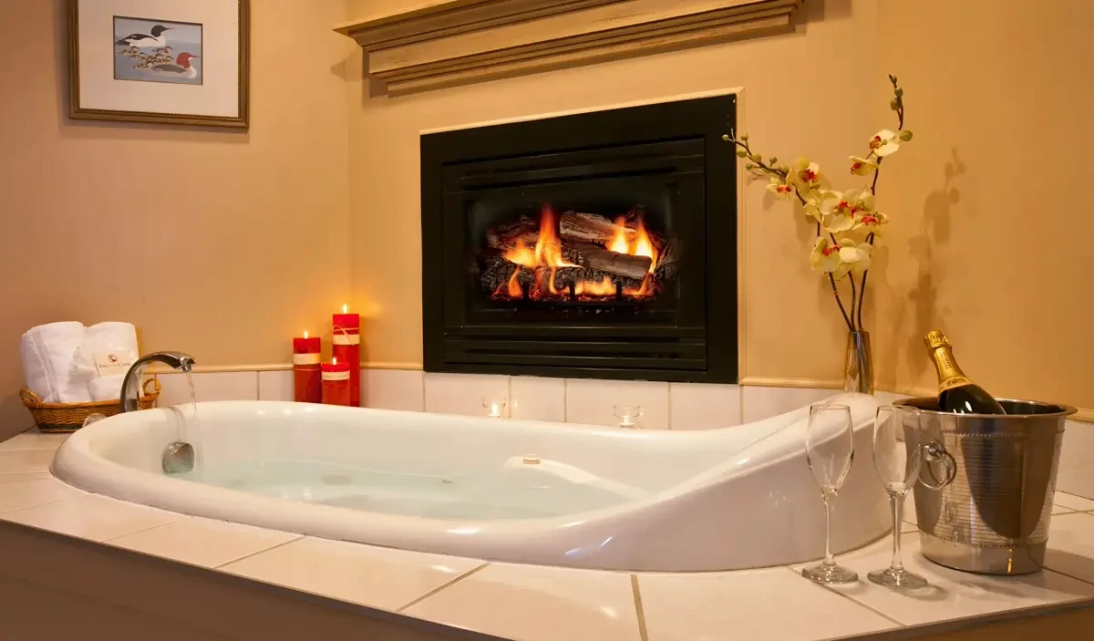 - →Private ensuite jacuzzi tubs – Positioned perfectly beside your electric fireplace for the ultimate romantic soak